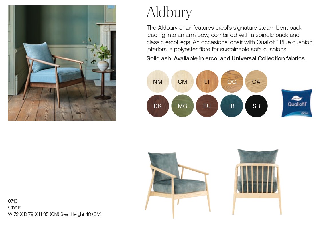 The Aldbury occasional chair features Ercol's signature steam bent back rail that flows into the arm bow, combined with a spindle back and classic Ercol shaped legs. Available in all premium solid ash wood finishes and fabrics from the signature 'Ercol Collection' and the 'Universal Collection'. Ercol's Aldbury utilises a new and environmentally-friendly Quallofil® Blue cushion interior, a polyester fibre for sustainable sofa cushioning. Aldbury is the perfect accent chair for an existing Ercol suite, or as a stand-alone piece in a bedroom or open-plan living space!