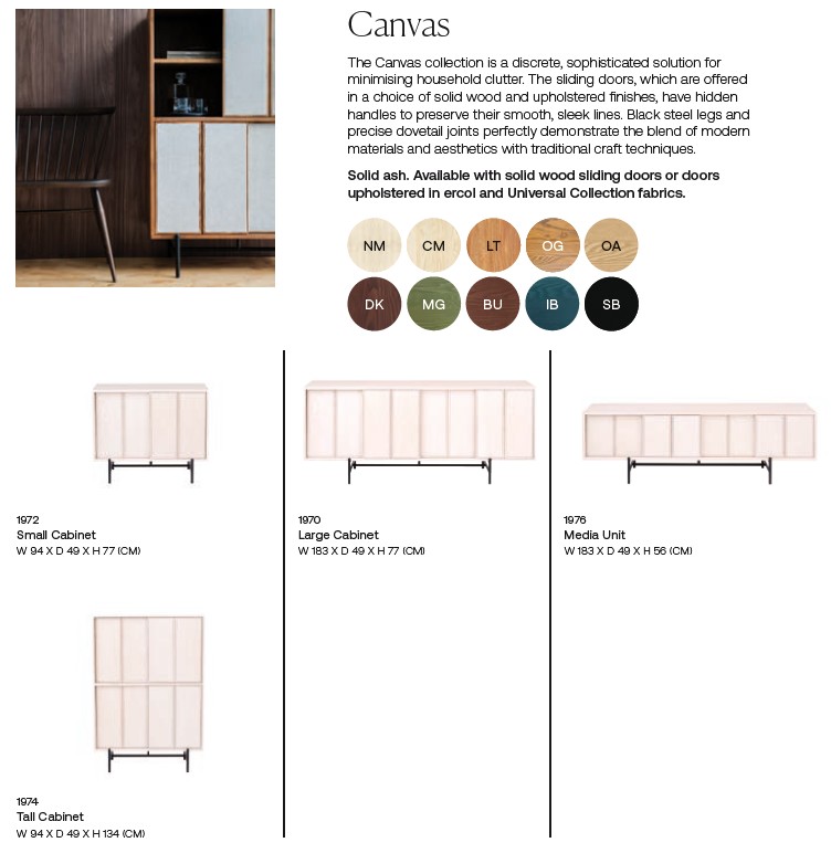 The Canvas Collection is a discrete and sophisticated solutioin for minimising household clutter! The distinctive sliding doors, which are offered in a choice of solid wood or upholstered finishes, have hidden handles to preserve their smooth and sleek lines. Black steel legs and precise dovetail joints perfectly demonstrate the blend of modern materials and aesthetics with traditional craft techniques. Our favourite item from this range is the Canvas Media Unit, which features three cupboards with an adjustable shelf in each. The centre cupboard has a cable managing hole, perfect for storing your digital boxes out of sight. All pieces within the Canvas Collection are made from solid ash timber, with the full selection of wood finishes and Universal Swatch fabrics.