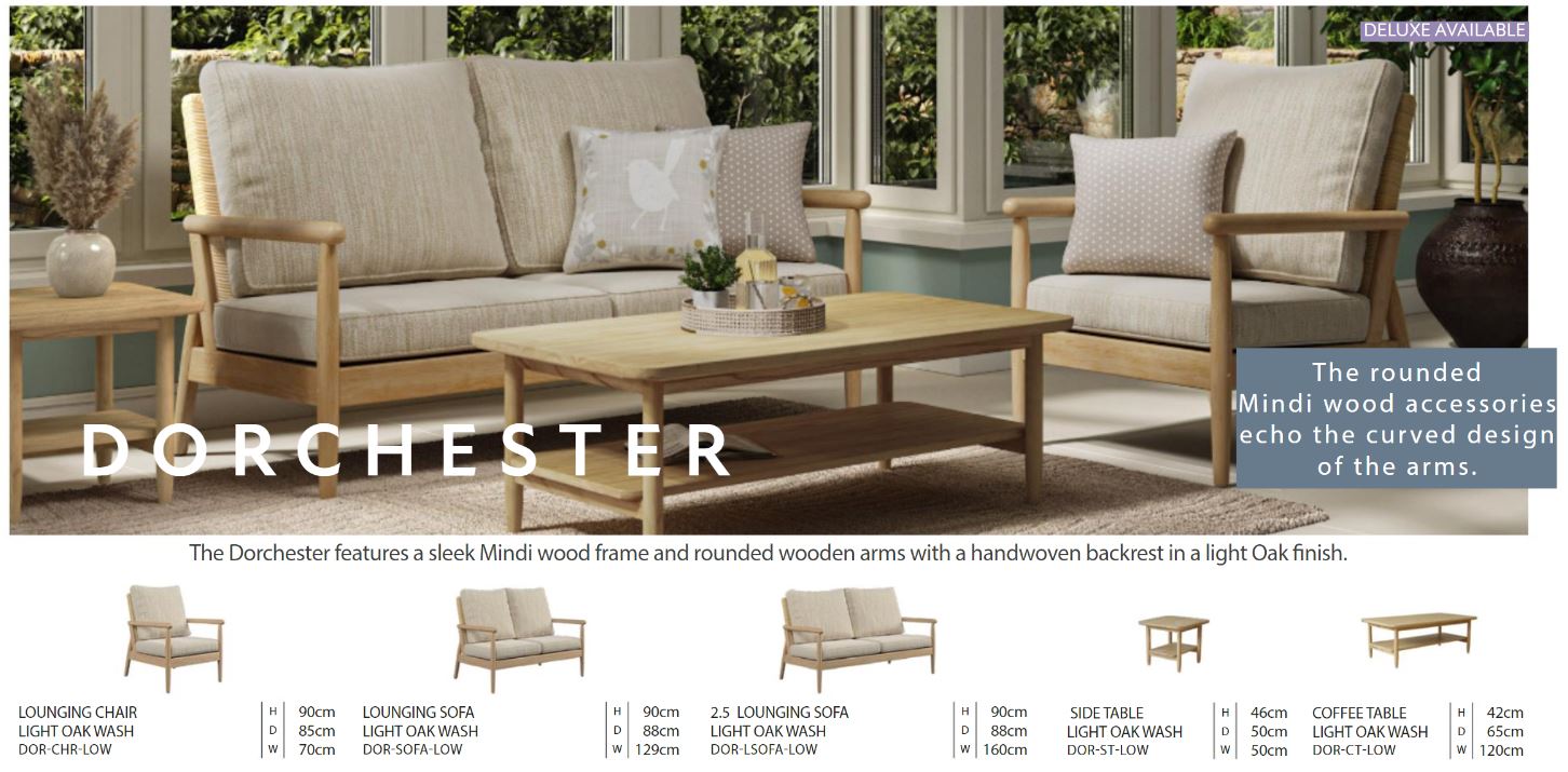 The Dorchester features a sleek Mindi wood frame and rounded wooden arms. The backrest is handwoven and presented in a light oak finish. The rounded Mindi wood side and coffee tables echo the curved design on the arms. The curved wooden arms allow lots of light pas and into your room or conservatory. Meanwhile, a fantastic selection of upholstery options allow you to create the look ideally suited for your home.