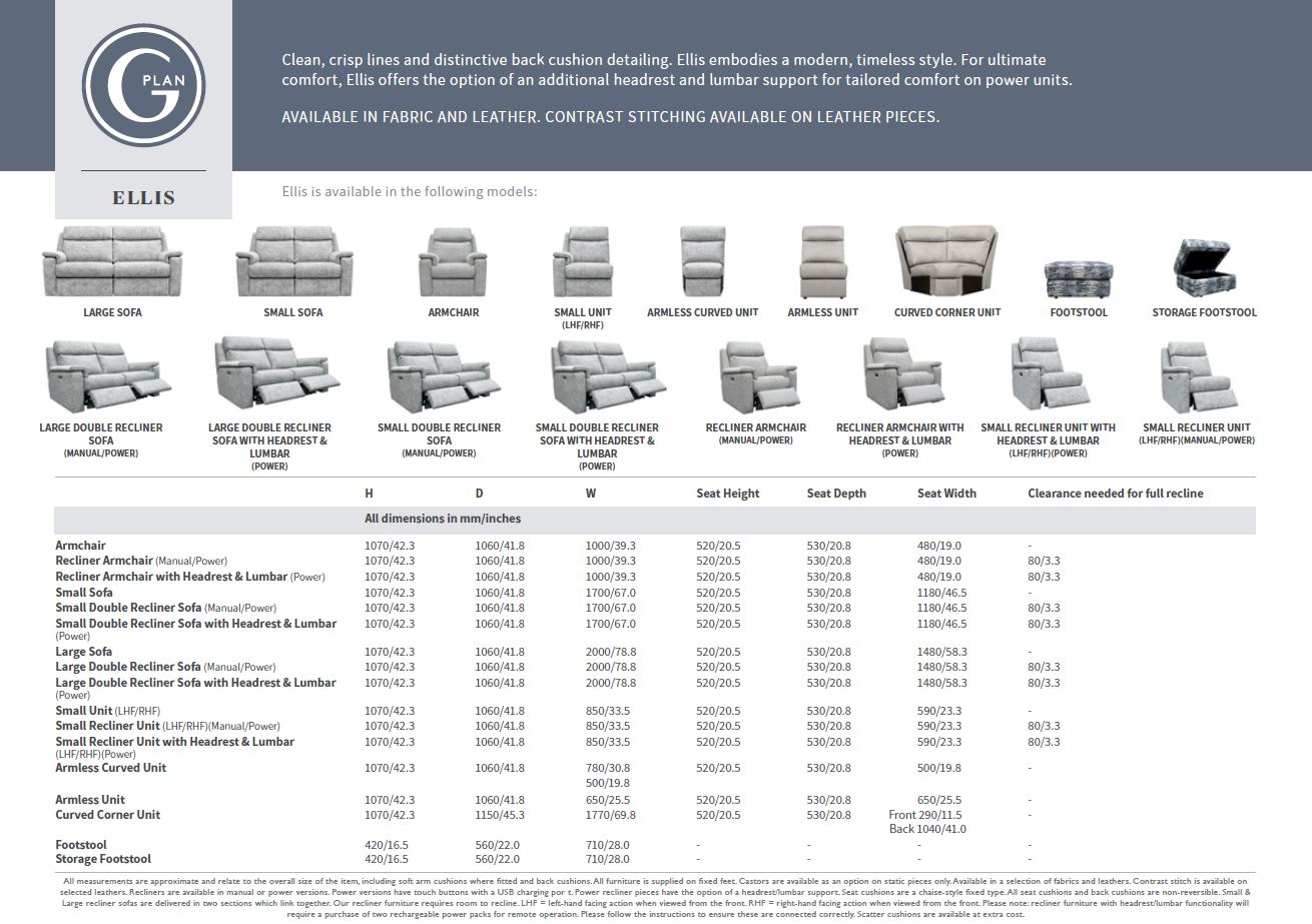 Clean, crisp lines and distinctive back cushion detailing. Ellis embodies a modern, timeless style. Stylish sweeping arms with soft indulgent arm pads cradle the luxurious deep seats. For ultimate comfort, Ellis offers the option of an additional headrest and lumbar support for tailored comfort on power units. Handy storage footstool option available. Premium foam arm pads offer additional comfort. Contrast stitching option available on selected leathers. Choose from a range of beautiful fabrics and leathers to suit your style. Also choose from corner modules to build a corner group sofa, with recliner options also available!