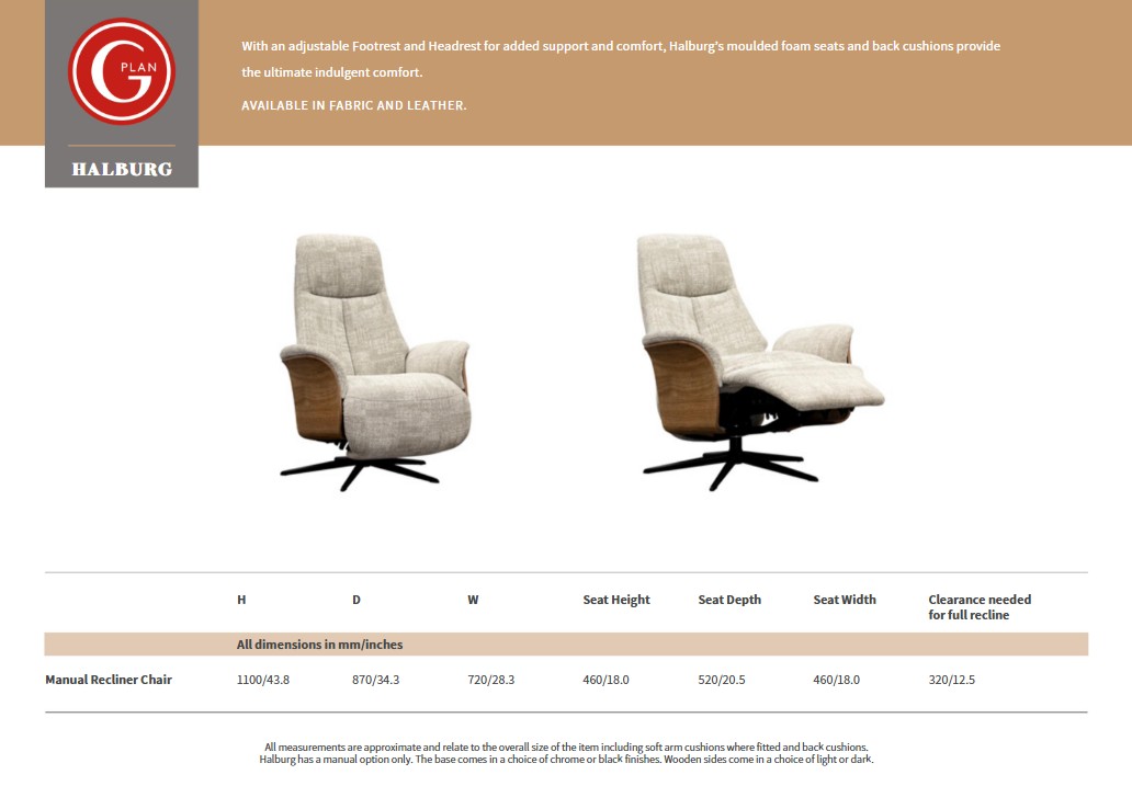 Halburg is a contemporary manual-reclining swivel chair and a great addition to G Plan's 'Ergoform' range of chairs. Halburg is a 'push-back' manual recliner chair, where leaning back against the backrest will unfold the integrated footrest from beneath. The backrest also reclines by using a gas spring, which is in turn operated by a small lever fitted between the seat cushion and the arm on the inner edge. Finally, a 'push-and-pull' manually-adjustable headrest allows the user to find optimum comfort as any degree of recline. The backrest has a vertical stitch detail, which promotes fantastic bolster support. This chair really has earned the name 'Ergoform'! The elegant wooden trim underneath the arms completes this contemporary look, and the choice of light or dark wood tones makes it easy to create a Halburg Chair ideally suited to your home.