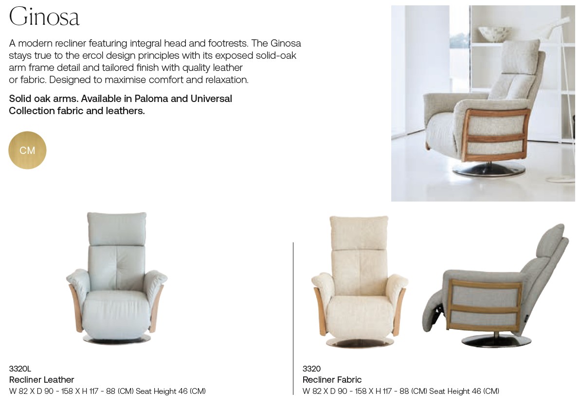 A recliner chair focused on luxurious upholstery, the Ercol Ginosa Recliner is a modern swivel chair with a tailored finish. Created to maximise comfort and relaxation, this recliner has been designed with an integral leg rest, saving space in your room without the need for a footstool to put your feet up. The exposed solid oak arm frame detail is quintessentially Ercol. Push back to produce the footrest, and recline fully with a chrome handle to operate the backrest. Available in a fabulous selection of luxurious leathers and fabrics from Ercol's 'Paloma' and 'Universal' collections.