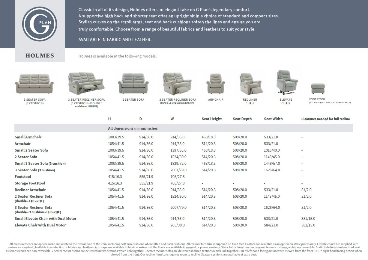 Classic in all its design, Holmes offers an elegant take on G Plan’s legendary comfort. A high back and shorter seat offer a supportive upright sit. Stylish curves on the scroll arms, seat and back cushions create soft lines. A choice of standard and small scale pieces are available to suit your space. Choose from a range of beautiful fabrics and leathers to suit your style.