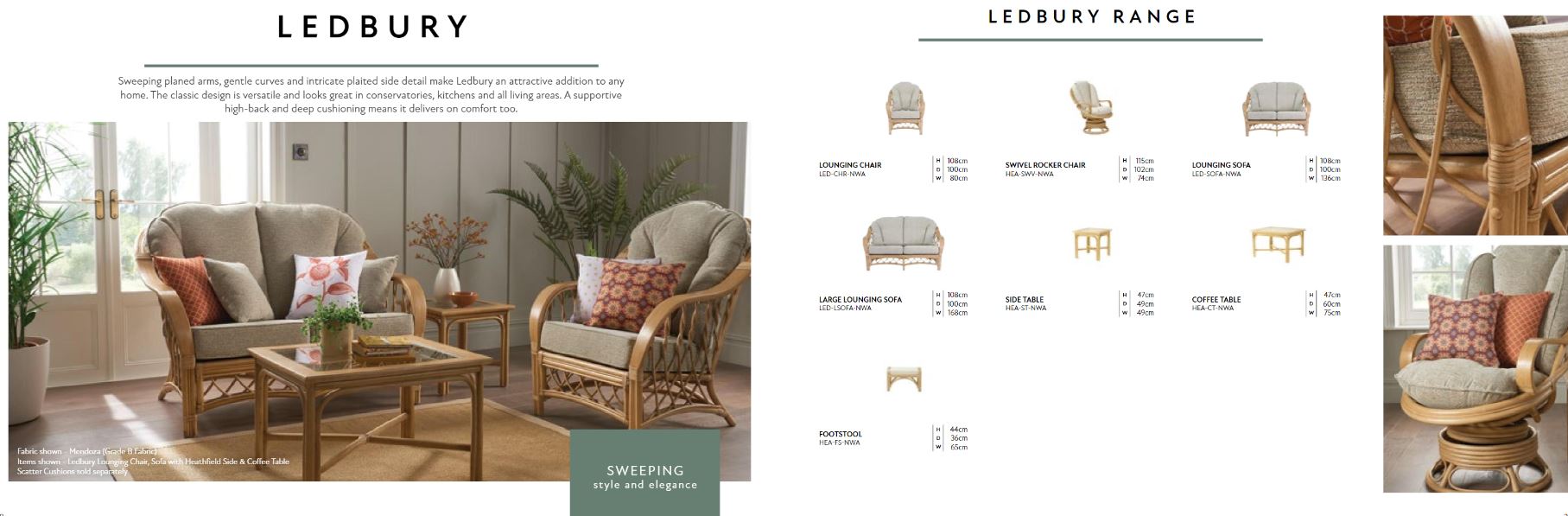 Sweeping planed arms, gentle curves and intricate plaited side detail make Ledbury an attractive addition to any home. The classic design is versatile and looks great in conservatories, kitchens and all living areas. A supportive high-back and deep cushioning means it delivers on comfort too!
