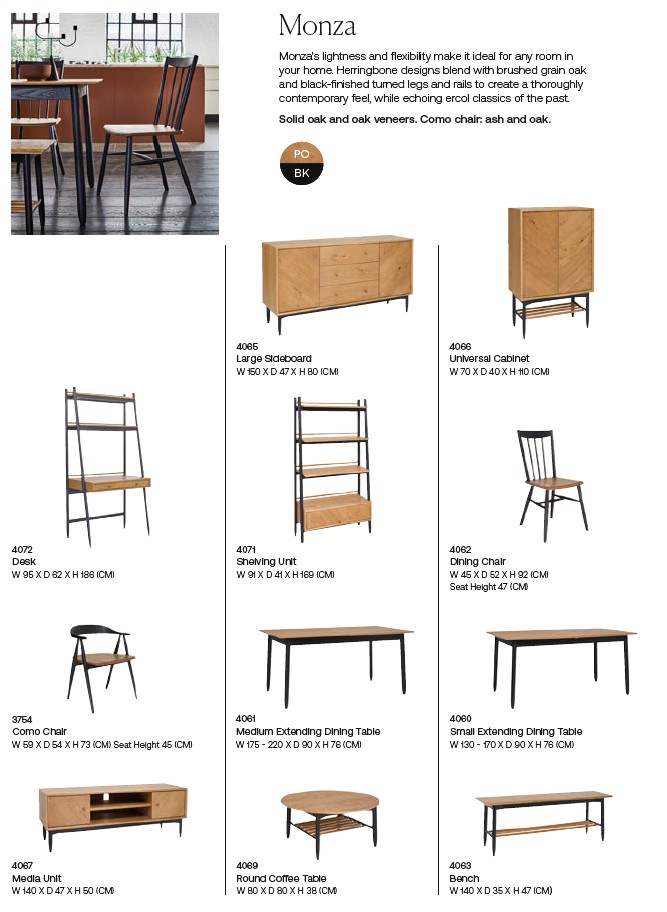 The Monza dining range is a collection of modern pieces that have flexibility to sit across any room in the home. Cabinets have striking herringbone design doors and drawers created by textured brushed grain oak displaying the character and tactility of the rustic wood, while the rich patina of the wood stain is complemented by black statement turned legs and plinth rails.
