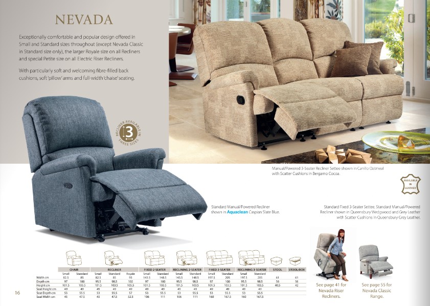 • All Nevada sofas are available in 2 different sizes, ranging from 'Small' through to 'Standard'. Meanwhile, Nevada armchairs are available in 3 sizes, ranging from 'Small' through to 'Royale'. This allows you to find the perfect size chair or sofa for you! It also makes it possible for a couple or a family to have their own seats, whilst still having all furniture match as part of a suite.