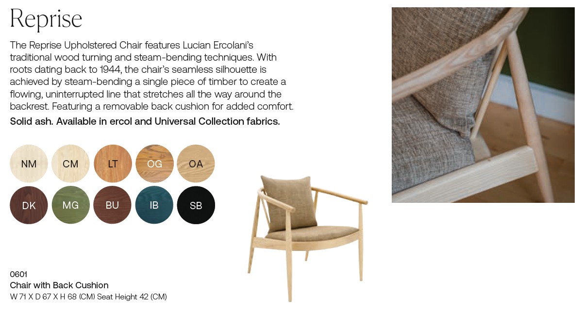 The Reprise Upholstered Chair features Lucian Ercolani’s traditional woodturning and steam-bending techniques. With roots dating back to 1944, the chair’s seamless silhouette is achieved by steam-bending a single piece of timber to create a flowing, uninterpreted line that stretches all the way around the backrest. Featuring a removable back cushion for added comfort. This chair is available in all Ercol's solid ash wood finishes, the upholstered seat and back cushion is offered in a selection of fabrics from the 'Ercol' and 'Universal' collections.