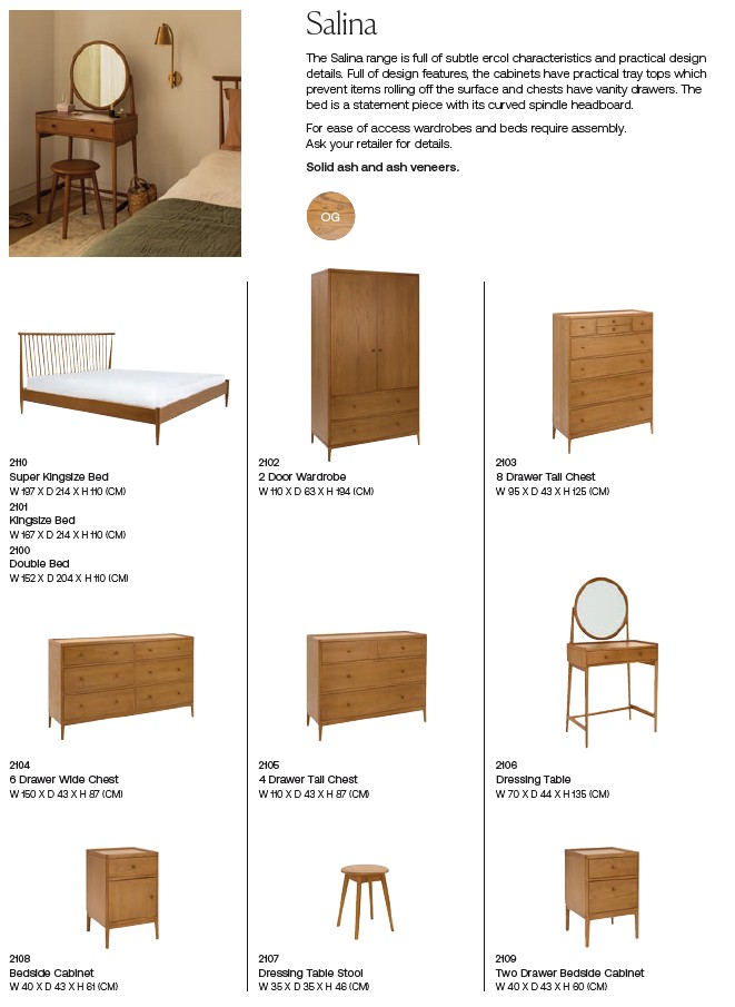 Please consult the product brochure attached above for the dimensions and specifications of each item within the Salina Bedroom Collection. If you require any further information, about this range or any other, please do feel very welcome to contact us and ask a member of our helpful sales team!