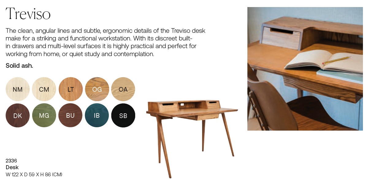 The Treviso Desk has clean and angular lines, alongside subtle details to provide ample space for laptops, notebooks and work supplies. Ergonomic and geometric in form, the Treviso boasts a distinctive profile with tilted wooden legs. The desk features three drawers; two smaller ones and one large drawer to tidy away all stationery and desk essentials. There is also a cable hole to take away all cables from the desk top and save further clutter. The Treviso is crafted from solid ash and is available in all Ercol wood finishes.