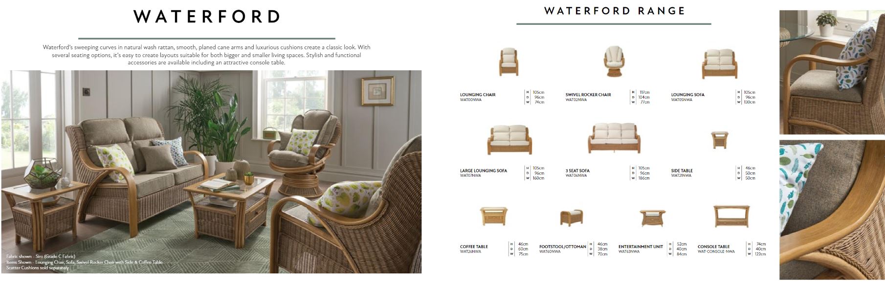 Waterford’s sweeping curves in natural-wash rattan, smooth planed cane arms and luxurious cushions create a classic look. With several seating and sizing options, it’s easy to create layouts suitable for both bigger and smaller living spaces. All seating has been handcrafted with a steel sprung base for increased longevity and additional comfort. This is then partnered with luxurious upholstered cushions; simply choose your desired fabric from Daro's fantastic collection to make it your own!