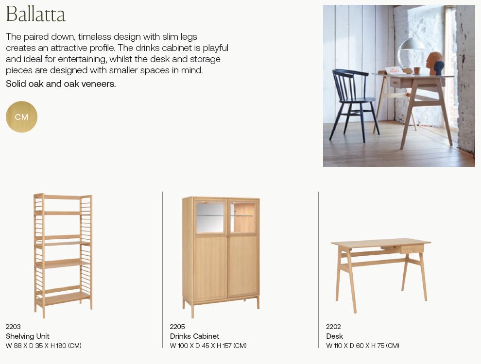 The pale oak Ballatta Collection is a range of flexible modern pieces that will work in a choice of locations in the home. The pared-down timeless design with slim, turned legs creates an attractive profile, pieces are designed to be practical and to create useful storage. The desk and shelving unit are pieces designed with smaller spaces in mind, offering great storage for not very much floor space. The collection is perfect for open plan living, or just a spare alcove.