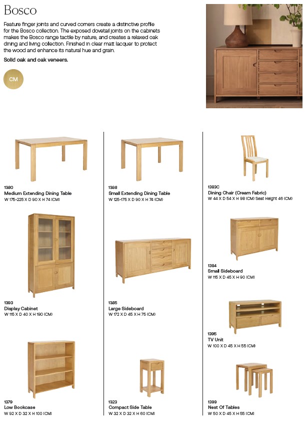 In designing Bosco, Ercol aimed to achieve flexibility and softness with the range at the same time as creating a strong modern feel. Bosco incorporates curves in order to emphasise the solidity of the timber and to keep the feel of the range 'soft'. The intention was to emphasise the tradition of cabinet craftsmanship by expressing the joinery in the pieces, clearly showing how the furniture is made. The curved finger joint is a signature characteristic of the Bosco range, featuring on the corners of the cabinets and the table and chair legs, whilst further finger jointing provides an eye-catching pattern on the drawer fronts. The joint detailing is clearly visible on the dining chair where the slats meet the top rail, creating a striking feature. 'Bosco' means wood in Italian, a fitting name for a range that showcases the natural beauty of this material!