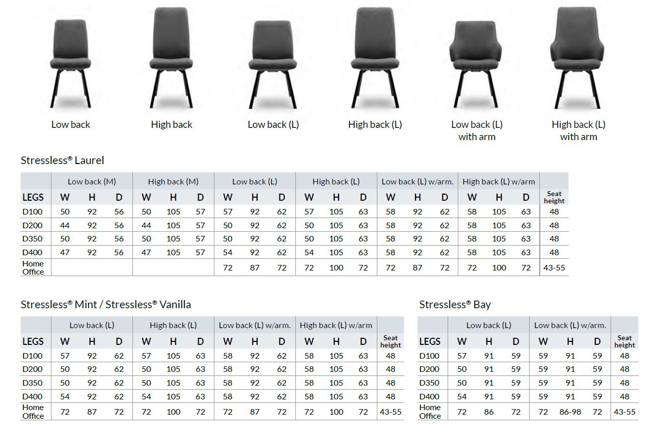 Please consult the product brochure attached above for the dimensions and specifications of the Stressless Dining Chair Collection. If you require any further information, about this range or any other, please do feel very welcome to contact us and ask a member of our helpful sales team!