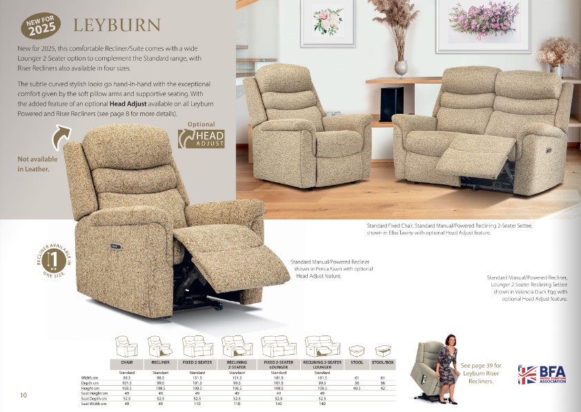 This comfortable and well-priced recliner suite comes with a wide 'Lounger 2-Seater' option to complement the standard range. The stylish curved looks go hand-in-hand with the exceptional comfort given by the soft pillow arms and supportive seating. With the added feature of an optional 'Electric Head Adjust' available on all Leyburn powered and riser recliners.